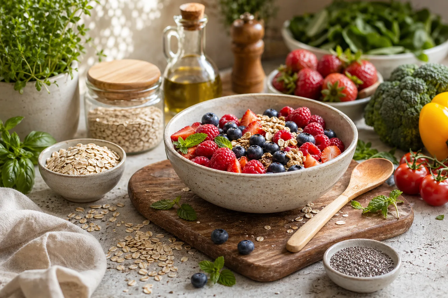 - Vláknina, hodně vlákniny. Cíl: 30 g denně. Luštěniny, ovesné vločky, jablka se slupkou, hrušky, mandle, bobule, pohanka, brokolice.